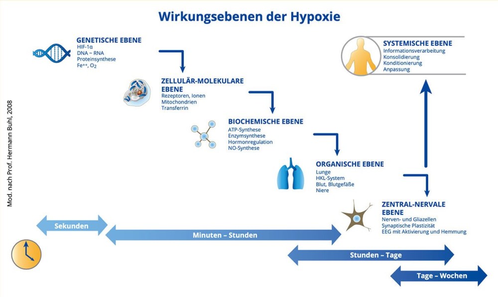Das klassische Höhentraining ist eine dauerhafte Hypoxie (tiefer Sauerstoffgehalt in der Höhe). Aber gerade die Kombination mit Hyperoxie (erhöhter Sauerstoff) kann zu anhaltenden gesundheitsfördernden physiologischen Anpassungen führen.